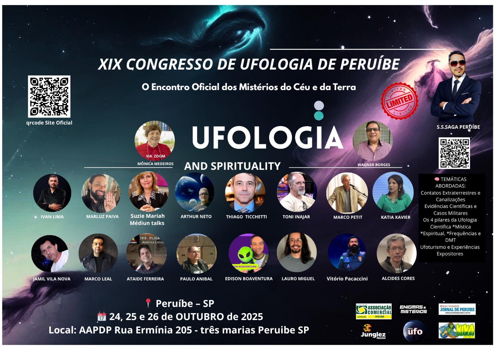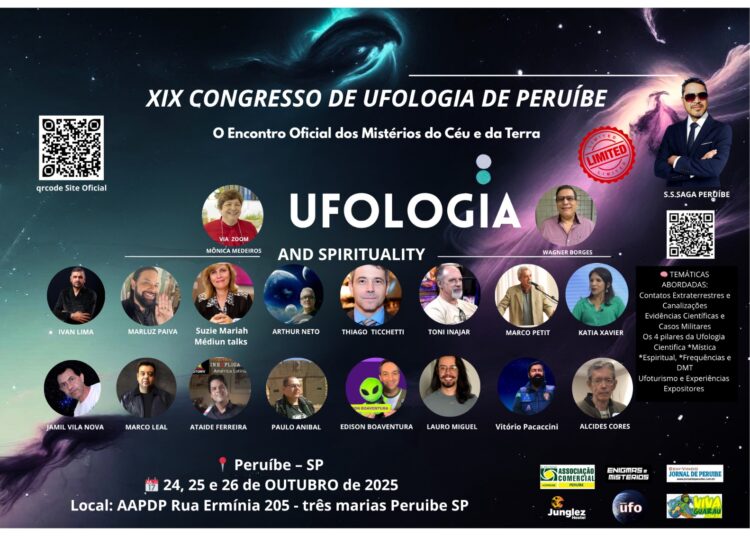 Entre os dias 24 e 26 de outubro de 2025, a cidade de Peruíbe (SP) será novamente o epicentro das discussões sobre vida extraterrestre, espiritualidade e fenômenos cósmicos. O XIX Congresso de Ufologia de Peruíbe, com o tema “O Encontro Oficial dos Mistérios do Céu e da Terra”, promete reunir os maiores nomes da ufologia brasileira em um evento que une ciência, misticismo e experiências de contato.